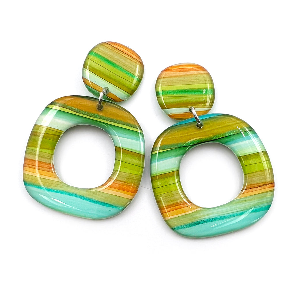 Organic multi-coloured stripes, painted by hand with ink on yupo paper, finished with glossy domed resin on both sides. Lightweight to wear. Each handcrafted pair is one of a kind.