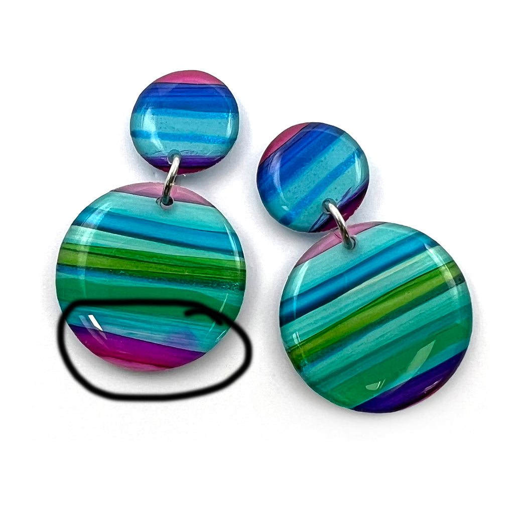 Organic multi-coloured stripes, painted by hand with ink on yupo paper, finished with glossy domed resin on both sides. Lightweight to wear. Each handcrafted pair is one of a kind.