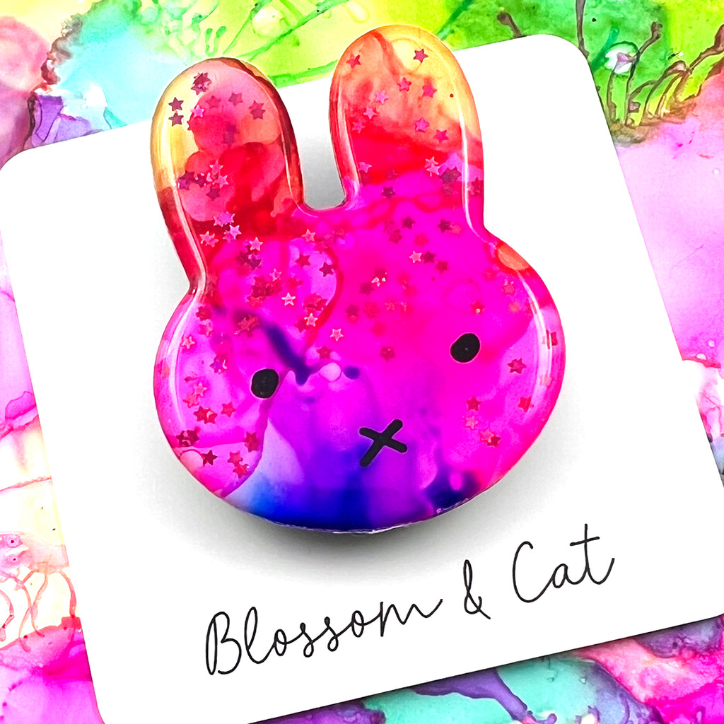 A sweet Miffy Art Brooch! Painted with ink on yupo paper, embellished by hand and finished with a glossy resin on both sides. Each handcrafted brooch is one of a kind. A cute friend to take with you wherever you go!