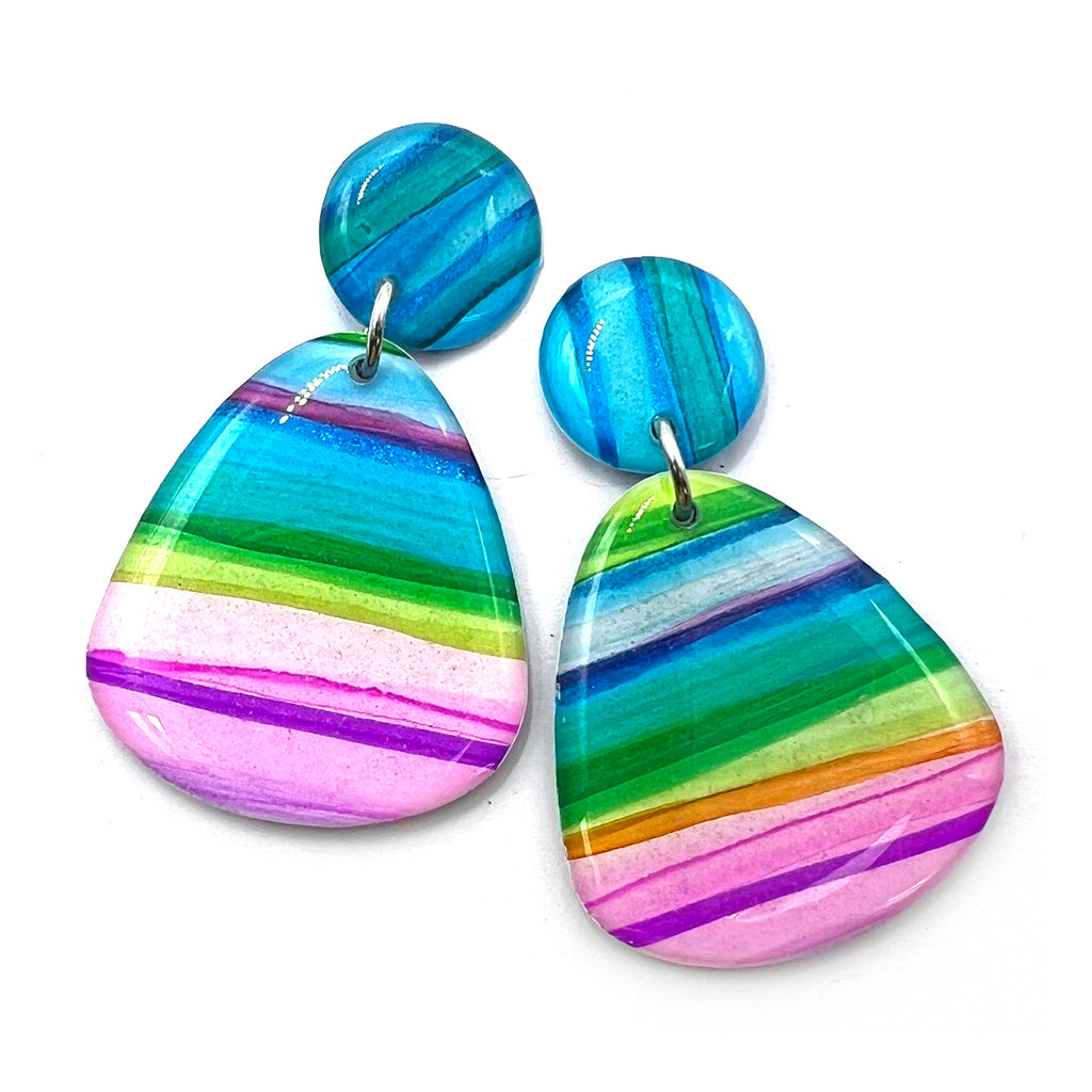 Organic multi-coloured stripes, painted by hand with ink on yupo paper, finished with glossy domed resin on both sides. Lightweight to wear. Each handcrafted pair is one of a kind.