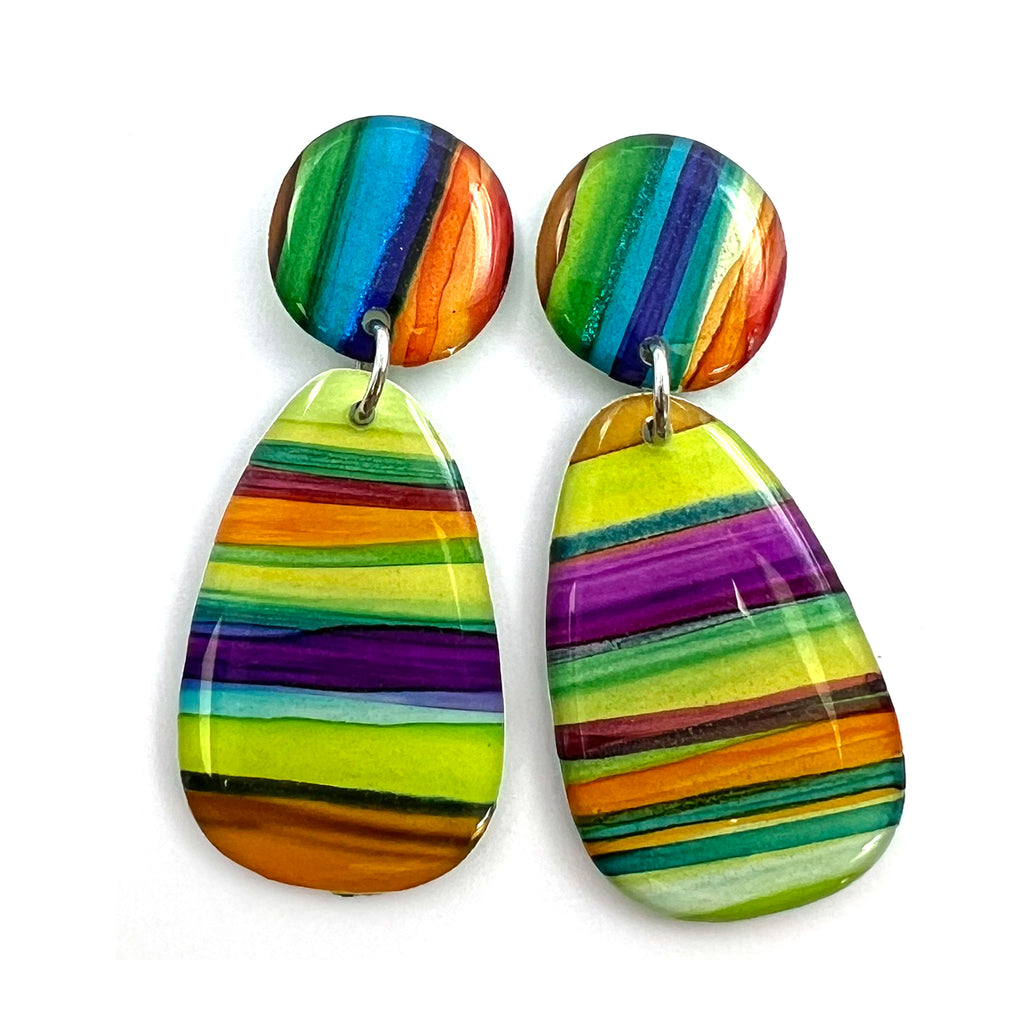 Organic multi-coloured stripes, painted by hand with ink on yupo paper, finished with glossy domed resin on both sides. Lightweight to wear. Each handcrafted pair is one of a kind.