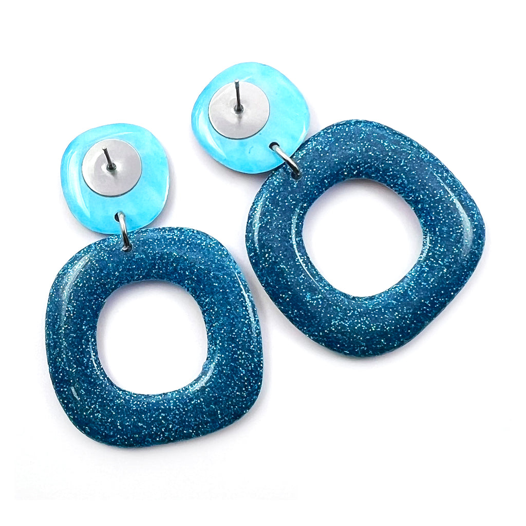 Organic multi-coloured stripes, painted by hand with ink on yupo paper, finished with glossy domed resin on both sides. Lightweight to wear. Each handcrafted pair is one of a kind.