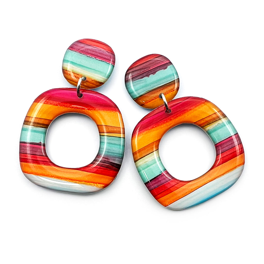 Organic multi-coloured stripes, painted by hand with ink on yupo paper, finished with glossy domed resin on both sides. Lightweight to wear. Each handcrafted pair is one of a kind.