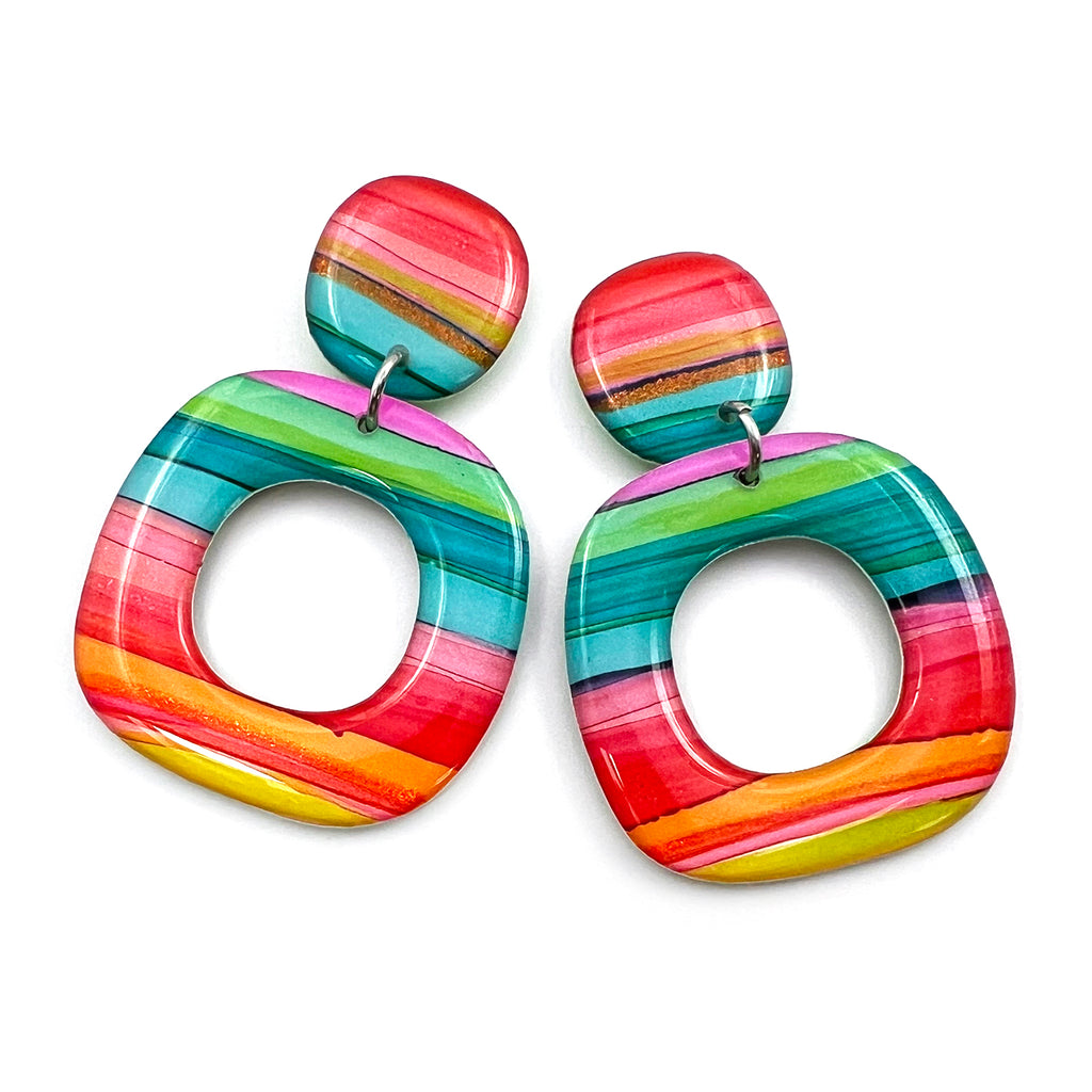 Organic multi-coloured stripes, painted by hand with ink on yupo paper, finished with glossy domed resin on both sides. Lightweight to wear. Each handcrafted pair is one of a kind.