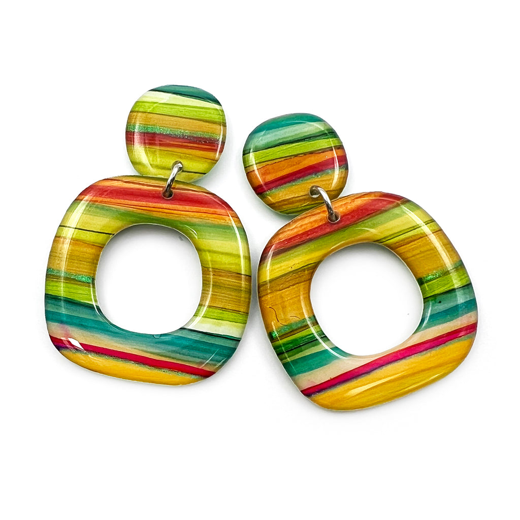 Organic multi-coloured stripes, painted by hand with ink on yupo paper, finished with glossy domed resin on both sides. Lightweight to wear. Each handcrafted pair is one of a kind.