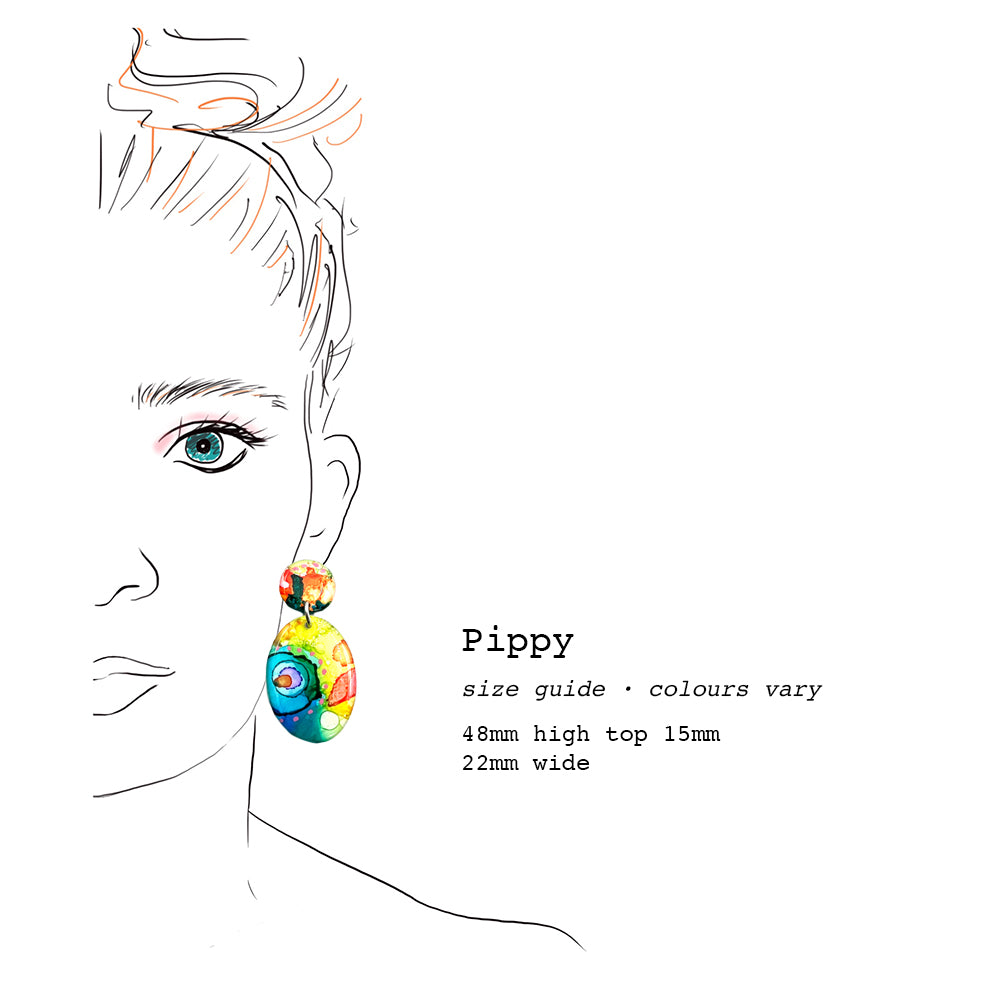 Painted by hand with ink on yupo paper, finished with glossy domed resin on both sides. Lightweight to wear. Each handcrafted pair is one of a kind.