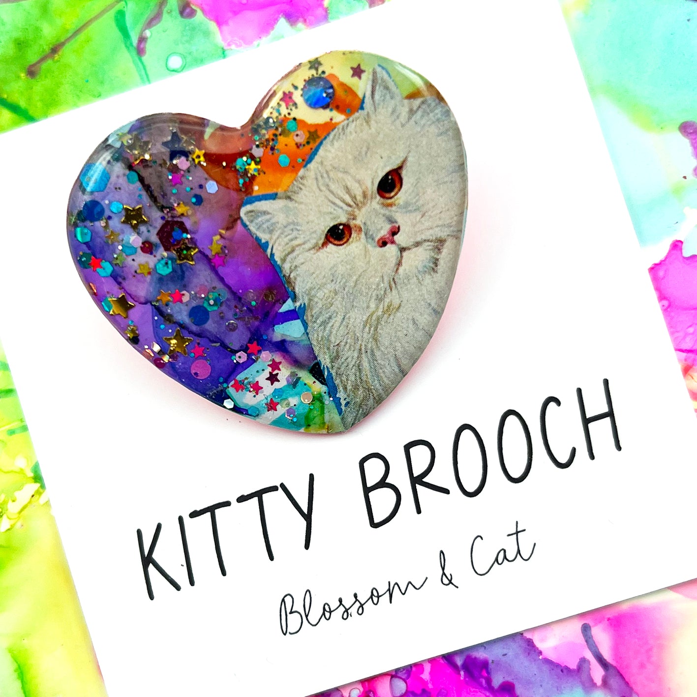 The cutest, cosmic handmade Kitty Brooch! Painted with ink on yupo paper, decorated with a cute kitty that has been rescued from a vintage postage stamp, finished with glitter and a glossy resin on both sides. Each handcrafted brooch is one of a kind. A perfect mini artwork for you to wear everyday.