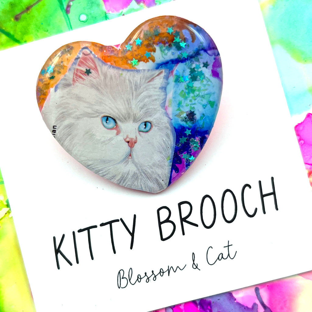 The cutest, cosmic handmade Kitty Brooch! Painted with ink on yupo paper, decorated with a cute kitty that has been rescued from a vintage postage stamp, finished with glitter and a glossy resin on both sides. Each handcrafted brooch is one of a kind. A perfect mini artwork for you to wear everyday.